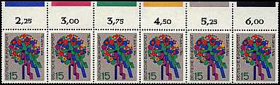 6-farbige Briefmarken die von 6 Platten gedruckt wurden erkennbar an den 6 Plattennummern auf dem Bogenrand |