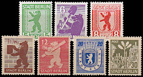Berlinaufdrucke: Dauerbriefmarken aus Berlin (West) 1948 - 1949 mit diagonalem Briefmarkenaufdruck "BERLIN" in schwarzer, roter oder grüner Farbe |