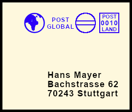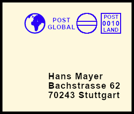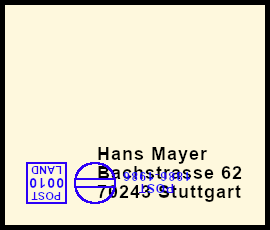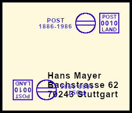 schräger Freistempel: Postsendung die durch einen Fehler mit einem Freistempel versehen wurde der nicht parallel zur Grundlinie ausgerichtet ist |
