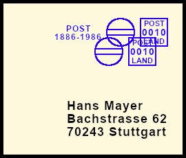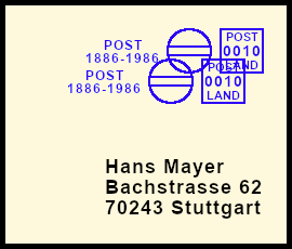 farbübersättigter Freistempel: Postsendung die durch einen Fehler mit einem unsauberen Freistempel versehen wurde hervorgerufen durch zu viel Farbe auf der Druckplatte |