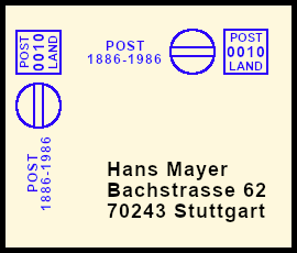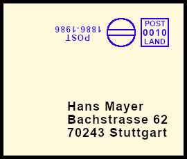 rückseitiger Freistempel: Postsendung bei der durch einen Fehler der Freistempel auf der Rückseite anstatt auf der Vorderseite ausgeführt wurde |