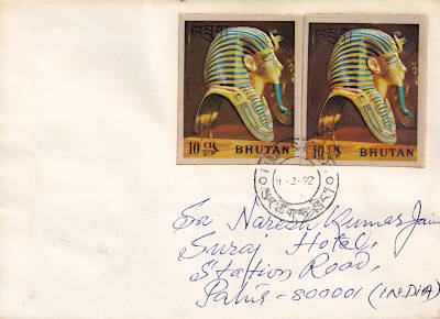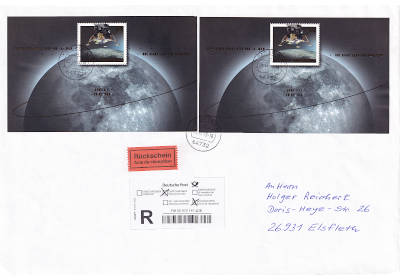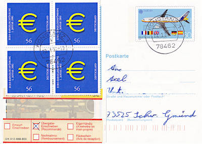 Quasieinzelfrankatur: Postsendung vorderseitig frankiert mit einer einzigen Briefmarke. Die restliche Frankatur befindet sich auf der (normalerweise nicht sichtbaren) Rückseite. Solche Postsendungen werden für Motivsammler produziert |