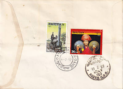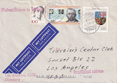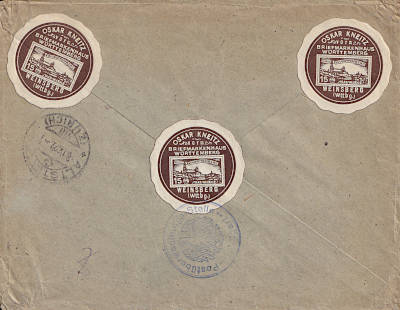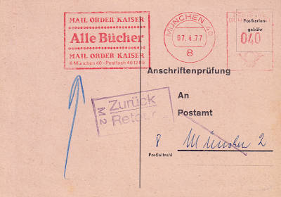 rückseitige Frankatur: Postsendung bei der die Frankatur auf der Rückseite aufgeklebt wurde |