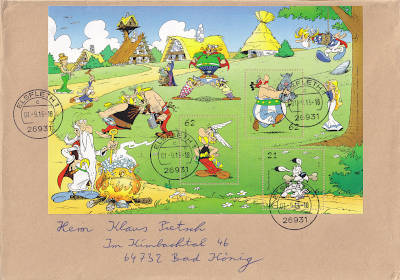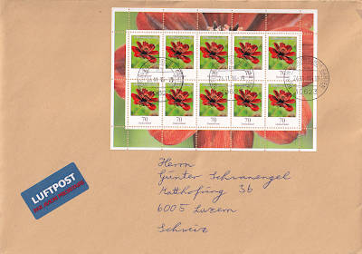 Heftchenblatteinzelfrankatur: Postsend-ung frankiert mit einem einzigen Heftchen-blatt |