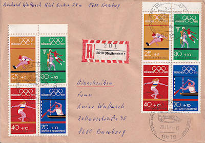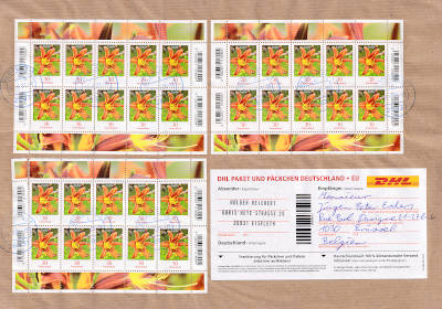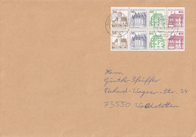 Heftchenblattmehrfachfrankatur: Post-sendung frankiert mit mehreren gleichen Heftchenblätter |