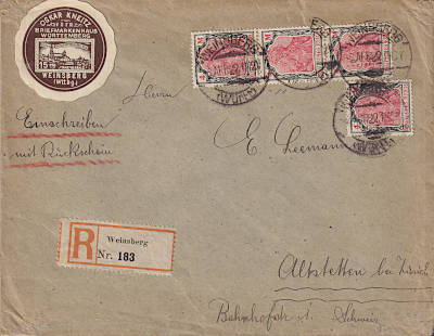 Postwertzeichenmischfrankatur mit Einschreibebriefmarke und Freistempel |