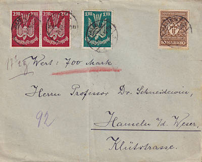 Briefmarkenartenmischfrankatur: Post-sendung frankiert mit Frei- und Sonderbrief-marken |