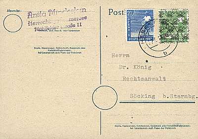 Nachsendungsfrankatur: Postsendung mit 2 Frankaturen die zweimal durch die Post befördert wurde, z. B. wenn diese durch eine Privatperson dem eigentlichen Empfänger nachgesandt wurde |