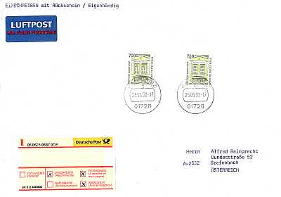 Cover with registeration, personal delivery, airmail and advice of delivery |