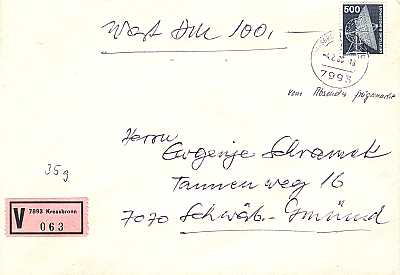 Absenderfreimachungsvermerk: Vermerk auf einer von einem Absender frankiert ein-gelieferten Postsendungen bei der die Über-frankatur nicht von der Post zu verantworten ist (5 DM anstatt 4 DM) |