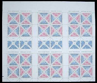 Zwischenstegherzstück mit Zierfeld: Einheit bei der als beabsichtigte Ausführung die vier außen liegenden Bogenfelder mit einem Briefmarkenbilddruck und die Bogen-felder dazwischen mit Zierfelder versehen wurden |